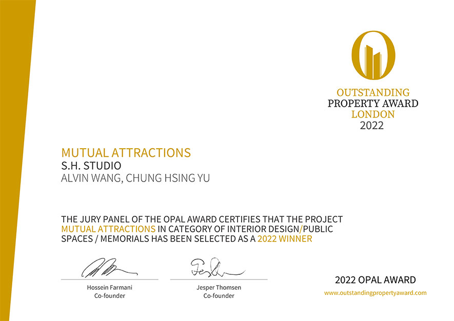 OUTSTANDING PROPERTY AWARD LONDON,OPAL(英國倫敦傑出地產大獎)由全球知名企業集團Farmani Group組織,並以招攬全球最佳建築師、室內設計師與房地產開發商為目標,在創造異業菁英聯合平台的同時,找尋各地最富創造力、革新感、社會影響力與永續性的設計方案。參與者有機會替自己最新穎的企劃,博得國際能見度,並且和產業的先驅及專業人士進行交流。