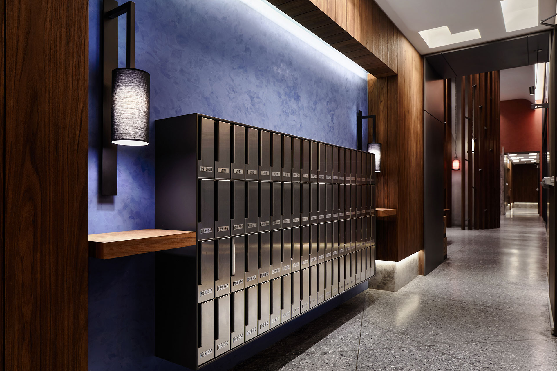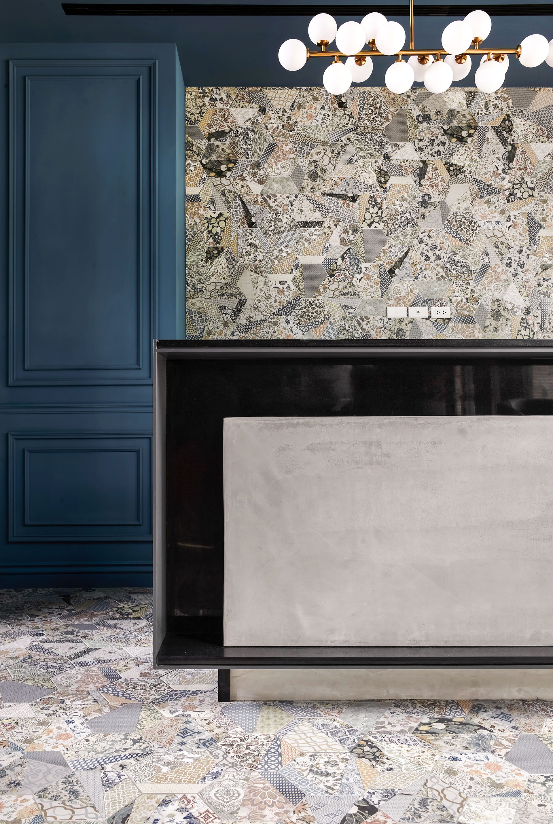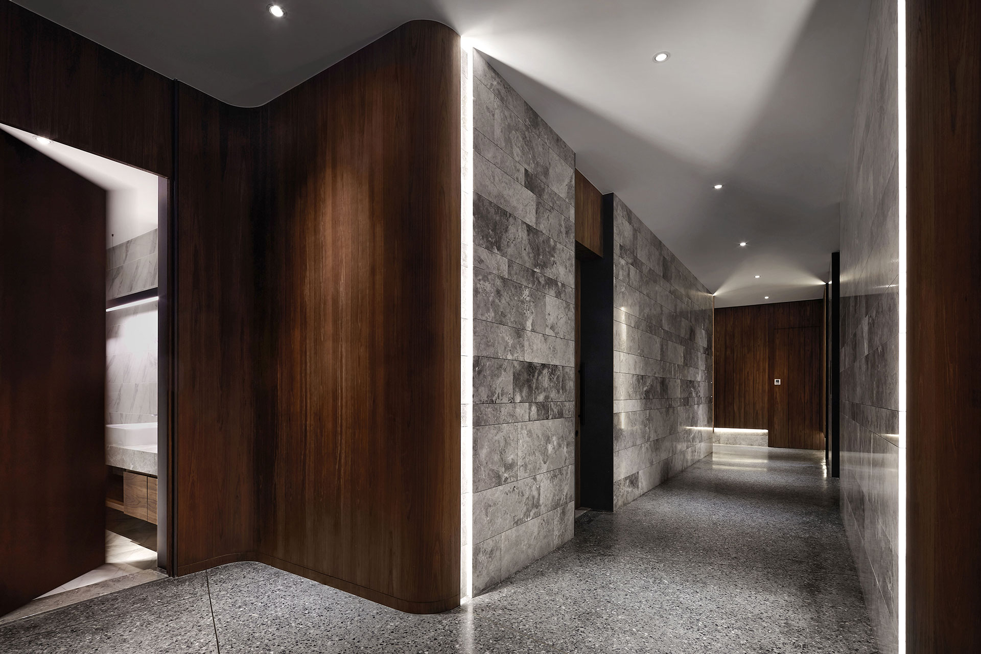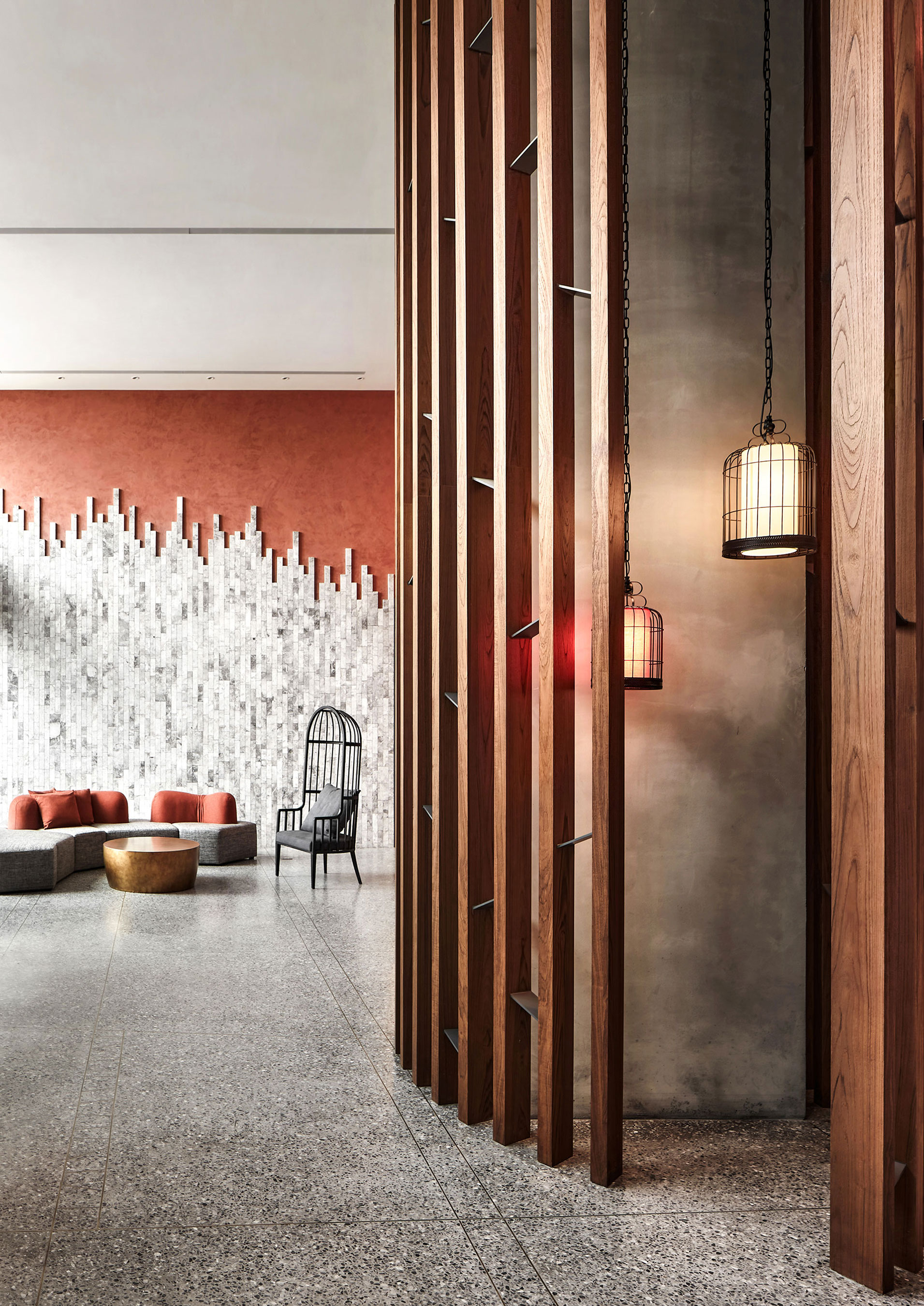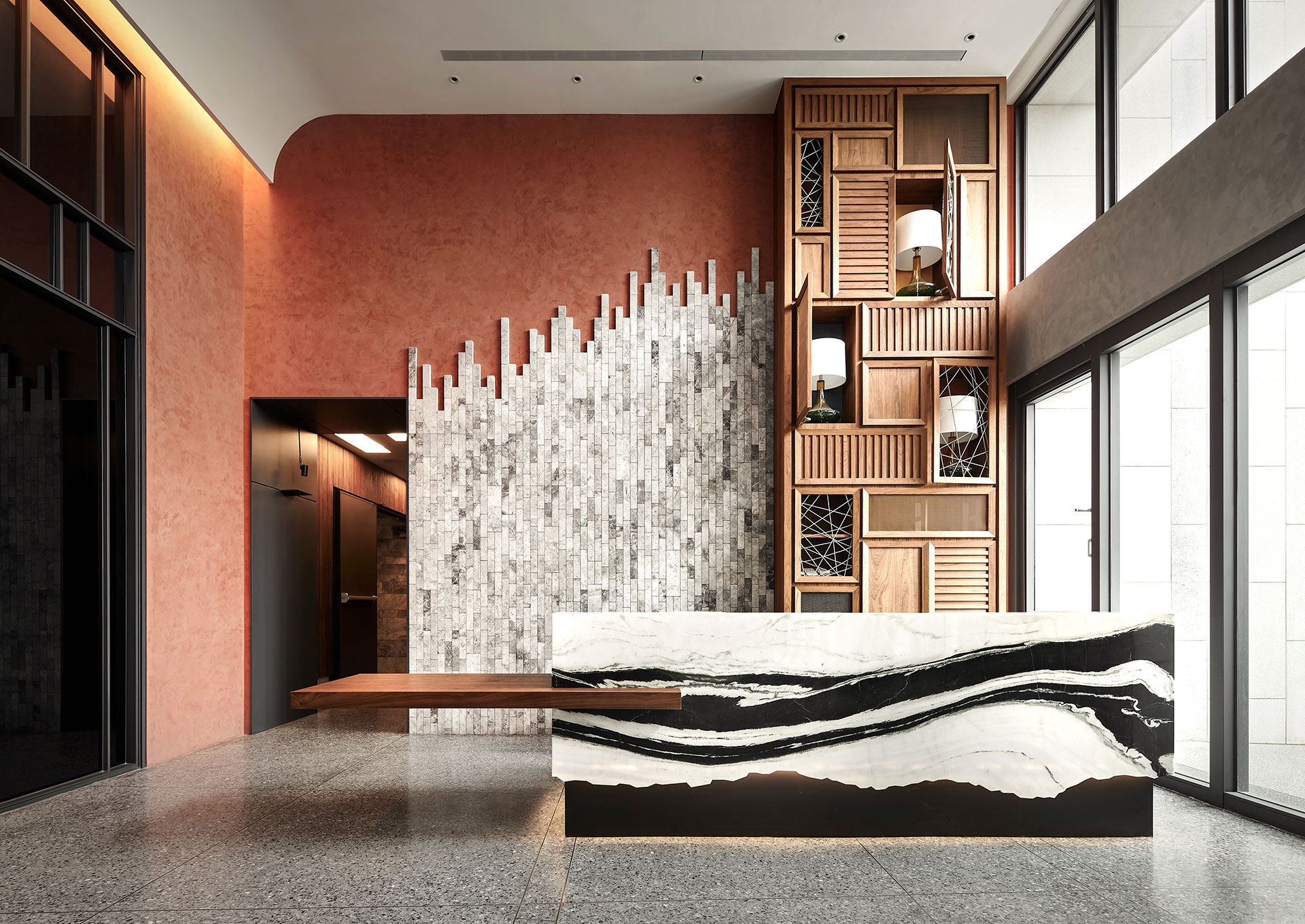 大廳壁面以灰白石材裁切成細長形以拼接成一不規則幾何,在橘紅挑高壁面上,成了強烈的迎賓視覺意象。