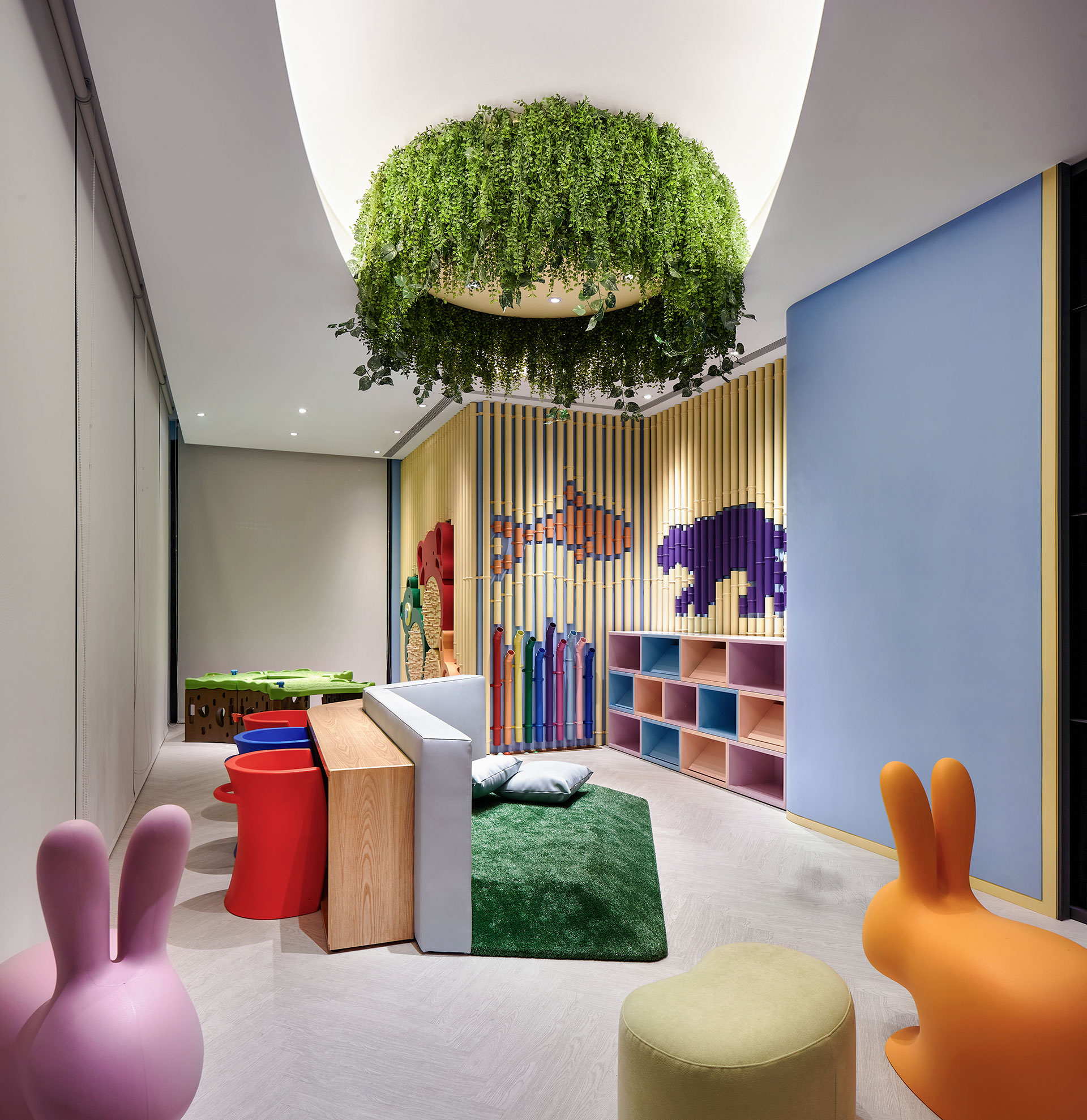 將大樓公設定為親子同樂空間,家長的暫歇所與孩童的玩樂天堂,設計以活潑、高彩度反差為基調,空間配置著重大廳、健身房、多功能交誼廳與兒童區之間的視線穿透,以大玻璃門窗相隔好互相照應。