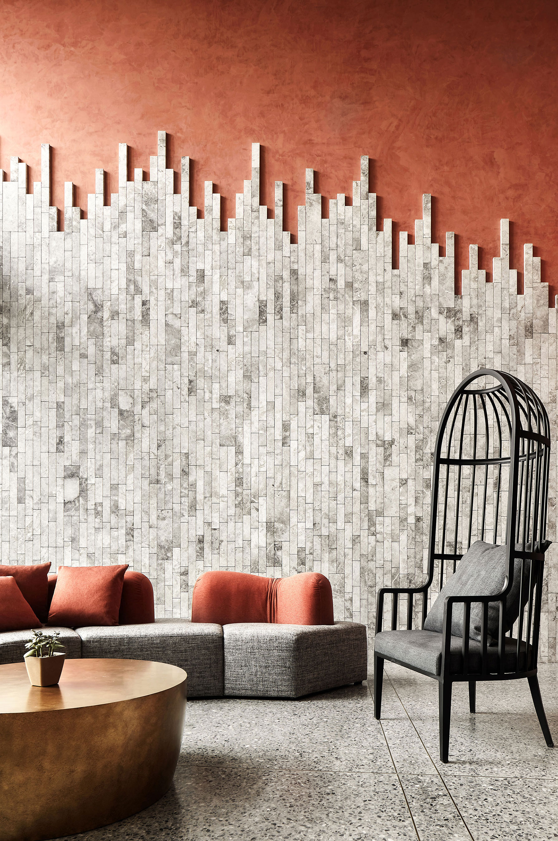 The collage of grey and white marble slates on the atrium wall that greets the visitor on the orange surface.