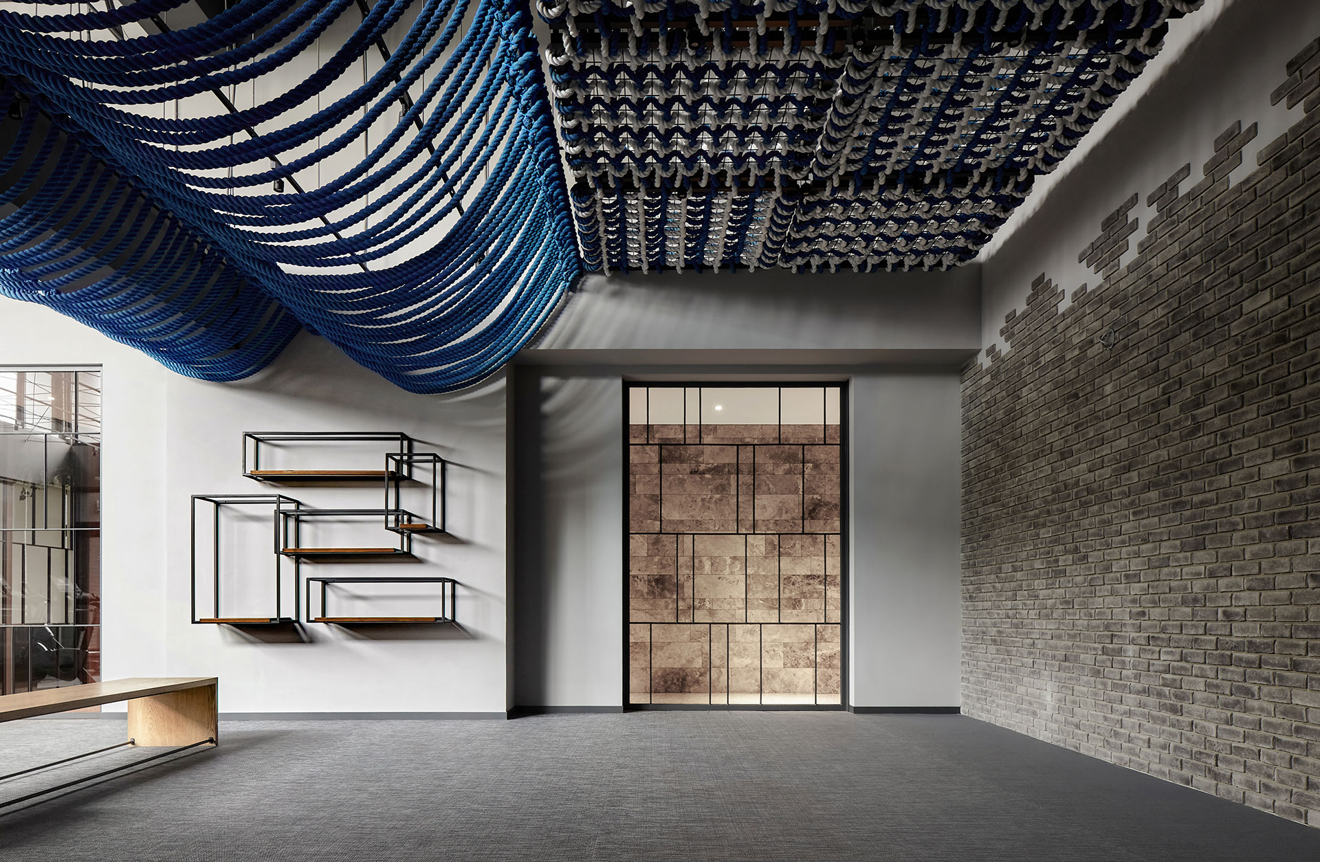 廊道上藍色漆料劃出大曲面弧形以達抽高天花的戲劇效果。